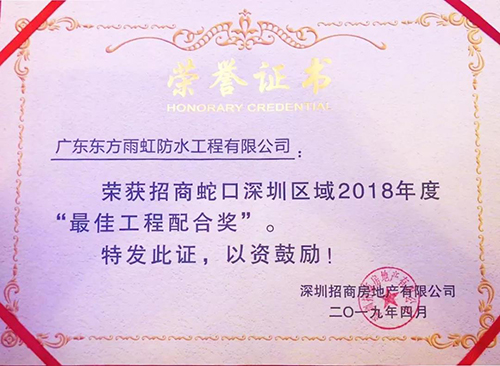 4月19日,“共筑大灣區(qū),精誠贏未來——2019年招商蛇口深圳區(qū)域供應(yīng)商大會”在深圳召開。東方雨虹憑借優(yōu)質(zhì)產(chǎn)品及高效服務(wù)榮獲招商蛇口深圳區(qū)域2018年度“最佳工程配合獎”。