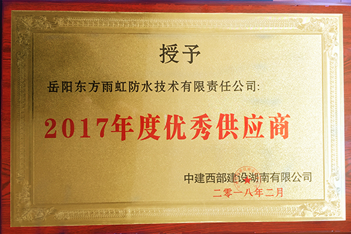 2月4日,由中建西部建設(shè)湖南有限公司舉辦的2017年度優(yōu)秀分供商表彰答謝會在湖南省長沙市中建大廈舉行。會上,對在2017年為中建西部建設(shè)湖南公司作出重要貢獻的戰(zhàn)略合作企業(yè)進行表彰。東方雨虹獲評“年度優(yōu)秀供應(yīng)商”榮譽稱號,這是東方雨虹自2015年起,連續(xù)三年蟬聯(lián)該獎項。