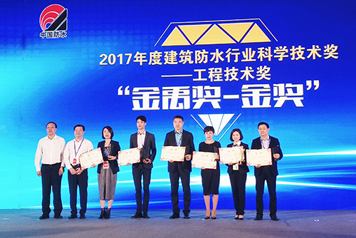 12月7日,全國建筑防水行業質量提升工作大會暨2017年建筑防水行業年會在海口召開。大會公布中國建筑防水工程“金禹獎”獲獎名單,東方雨虹以兩金一銀的成績名列榜單首位。應用技術中心總工助理林海俠女士代表東方雨虹領獎。