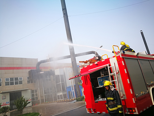 28日下午14時50分,隨著瀝青卷材環保裝置火災警報突然響起,唐山生產基地立即啟動火災撲救及應急疏散預案。應急小組迅速就位,全體員工有序撤離;唐山市豐南區消防大隊官兵接到報警電話后抵達現場開展滅火救援,消防演習取得圓滿成功。