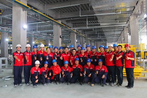 凝結了建設開發團隊、車間全體員工、施工單位232天的辛勤汗水和付出,唐山聚氨酯防水涂料生產線比原定計劃開機時間提前半個月投產。這條生產線,是東方雨虹第二條聚氨酯防水涂料生產線,擁有29臺反應釜、56臺儲罐&計量罐、4365個閥門、20000余米管線;配備多套獨立的真空系統、空壓站、冷卻水系統、冷凍水系統、制氮系統、粉料輸送系統和包括機械手在內的6條全自動罐裝線,從上桶到尋口,到上蓋、貼標、掃碼、碼垛、纏膜全過程自動化;熱能綜合利用,節能且節約成本;采用高性能SIEMENS S7-400CPU、18IO從站、2368點DI、1152點DO、424點AI、120點AO、多達19稱重系統,70臺變頻電機驅動及大量普通驅動電機;全方位控制溫度、液位、重量、壓力、真空、流量,通過十幾套順控流程精準控制各產品線的生產工藝流程;而整條生產線的控制,僅需要12名工人。