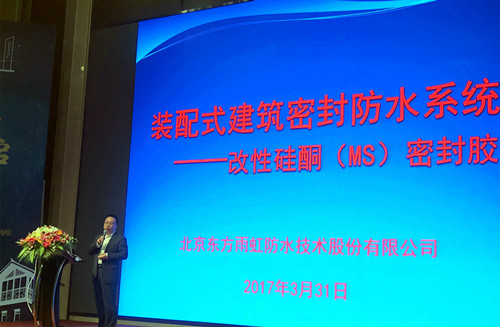 會上,朱衛(wèi)如作“裝配式建筑密封膠防水系統(tǒng)解決方案”主題報告,從裝配式建筑密封防水系統(tǒng)的開發(fā)背景和產(chǎn)品研制來源入手,針對裝配式建筑防水提供系統(tǒng)解決方案;詳細介紹了東方雨虹改性硅酮密封膠系列產(chǎn)品的產(chǎn)品性能、優(yōu)勢和施工工藝,其中包括建筑石材專用改性硅酮密封膠、PC建筑專用改性硅酮密封膠、門窗專用改性硅酮密封膠和防霉專用改性硅酮密封膠,這四款產(chǎn)品貼合裝配式建筑的特點,系統(tǒng)滿足了裝配式建筑密封防水的功能需求,尤其適用于裝配式建筑工程。