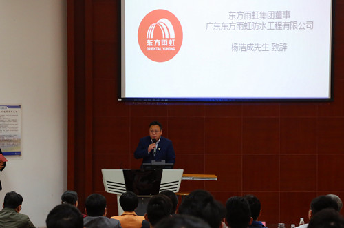 3月27至29日,東方雨虹在廣州城建職業(yè)學(xué)院開展為期3天的校企合作國際專家定向培訓(xùn)。本次培訓(xùn)的目的旨在深入校園、選撥招聘在校大學(xué)生、定向培育專業(yè)技術(shù)人才、推廣國際職業(yè)培訓(xùn)。 27日早上9點,廣州城建職業(yè)學(xué)院校長劉國生,副校長程忠國、周暉,廣東東方雨虹董事長兼總經(jīng)理楊浩成、總經(jīng)理助理王愛超,東方雨虹職業(yè)學(xué)院校長助理王宇等出席本次培訓(xùn)課程開幕式。參與開幕式的還有此前從廣州城建職業(yè)學(xué)院建筑工程學(xué)院約400名中嚴格篩選出的50名學(xué)生。