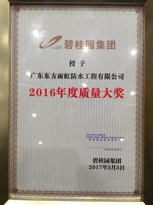 3月3日下午,由碧桂園集團舉辦的“迎機遇 促共贏”2017年供應商大會于佛山市順德北滘鎮碧桂園總部大樓成功召開。廣東東方雨虹憑借多年來一如既往的優質產品和系統服務榮獲碧桂園集團“2016年度質量大獎”榮譽稱號。廣東東方雨虹董事長兼總經理楊浩成受邀出席本次大會。 據悉,參與本次大會的知名品牌供應商多達300余家,而獲獎的單位數量僅為所有合作伙伴的百分之一,東方雨虹在眾多企業中脫穎而出,名列榜單,是碧桂園集團對公司產品、服務質量的高度認可。東方雨虹與碧桂園集團攜手合作已經是第四年,在這四年的時間里,東方雨虹一直秉持質量優先、服務至上的經營理念;以誠信合作、優質產品、高效供貨速度和專業服務去贏得行業及社會各界的高度肯定與信賴。 碧桂園作為福布斯世界500強企業,憑借獨具核心競爭力的發展模式建造老百姓“買得起”的好房子;而東方雨虹致力于為人類打造“不漏水”的好房子,企業使命不謀而合。在接下來的日子里,東方雨虹將繼續攜手碧桂園集團為人類為社會創造持久安全的環境而努力。