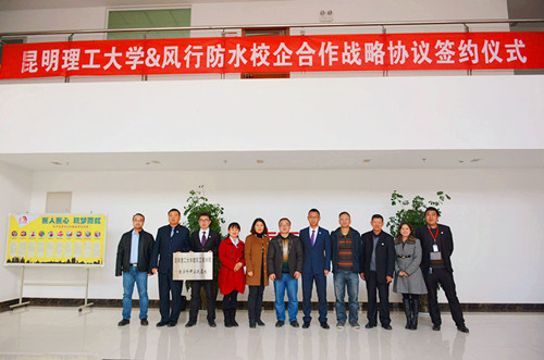 昆明理工大學建筑工程學院院長郭榮鑫,院黨委書記馬應良,副院長王志浩,院黨委副書記戴煒,辦公室主任王薇等有關領導蒞臨風行防水生產研發物流基地參觀交流。昆明理工大學建筑工程學院院長郭榮鑫與風行防水總經理呂學強達成一致,當場簽約,昆明理工大學建筑工程學院黨委書記馬應良為風行防水授予了“昆明理工大學建筑工程學院教學科研實踐基地”牌匾,標志著雙方正式達成合作。