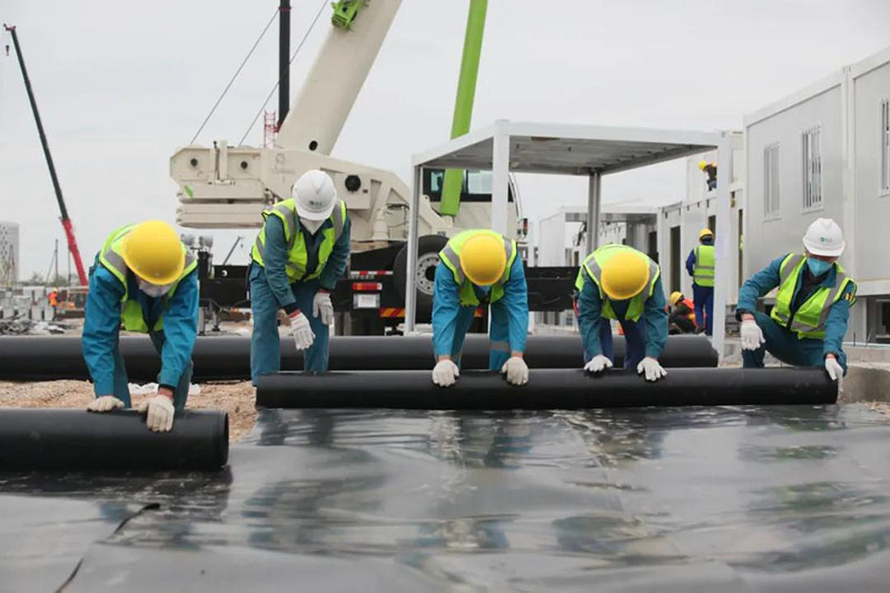 在接到馳援任務后,天鼎豐第一時間將項目建設所需土工布裝車,迅速運往施工現場。高能環境在運抵防滲膜之后,承擔該項目的防滲工程建設。在按質按量穩定推進的同時,全力以赴保工期。