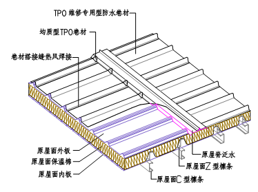 在常規的金屬屋面系統中復合一層TPO防水層,以解決金屬屋面易滲漏、保溫隔熱效果差的固有缺陷。
