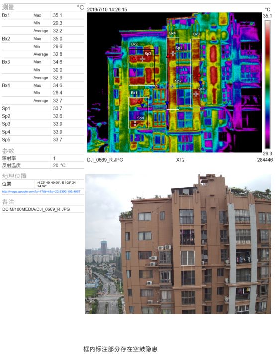 近年來,隨著建筑外墻粘貼面磚的普遍采用,建筑外墻面磚粘接劑空鼓脫落現(xiàn)象也經(jīng)常發(fā)生。本文針對以下紅外熱成像儀所檢測的圖片所展現(xiàn)的空鼓問題,提出技術(shù)方案。