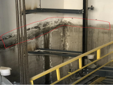 電梯井內部金屬構件因修飾膨脹,致使金屬構件與混凝土間的間隙加大,地下水通過混凝土間隙滲入電梯井內部,造成電梯井內部滲水。