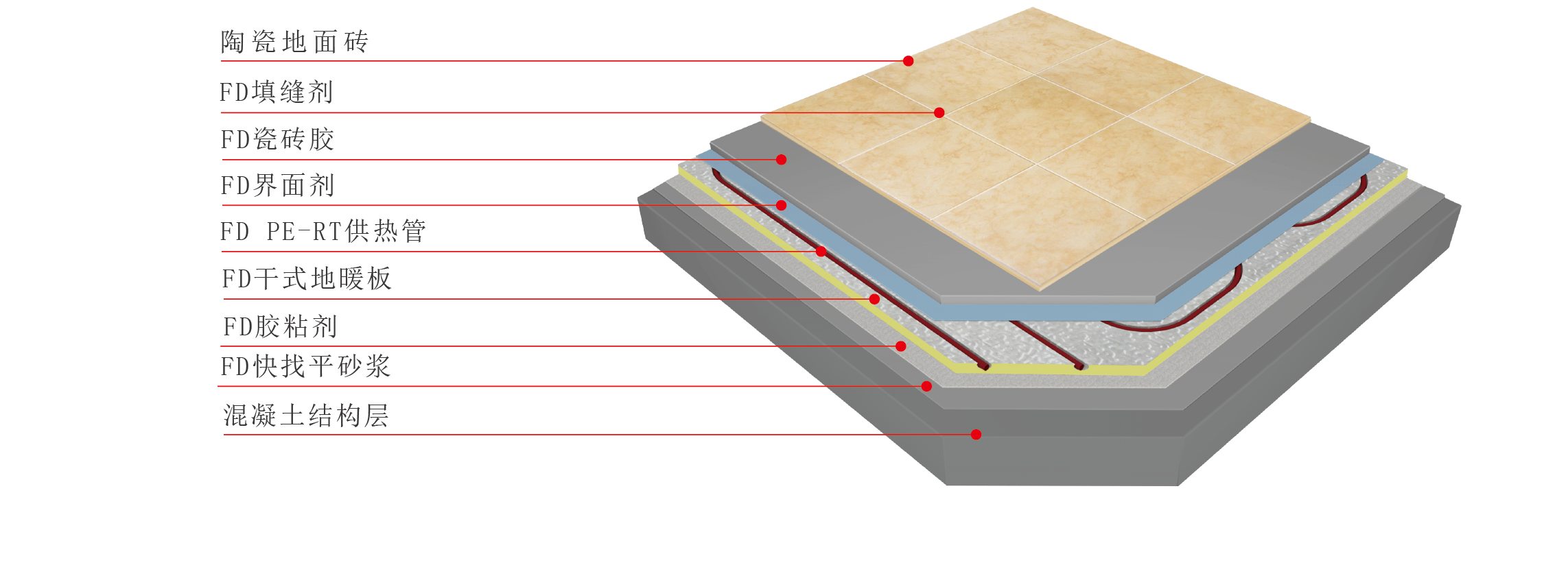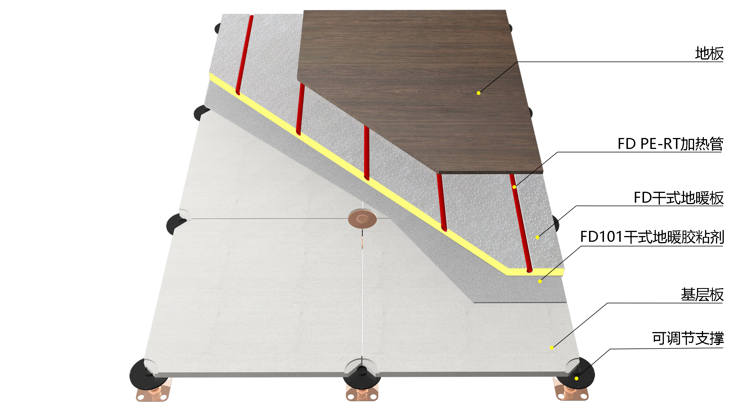 FD干式地暖系統是將加熱管或加熱電纜敷設在FD干式地暖板的溝槽中,不填充混凝土,直接鋪設面層的地面輻射供暖構造。