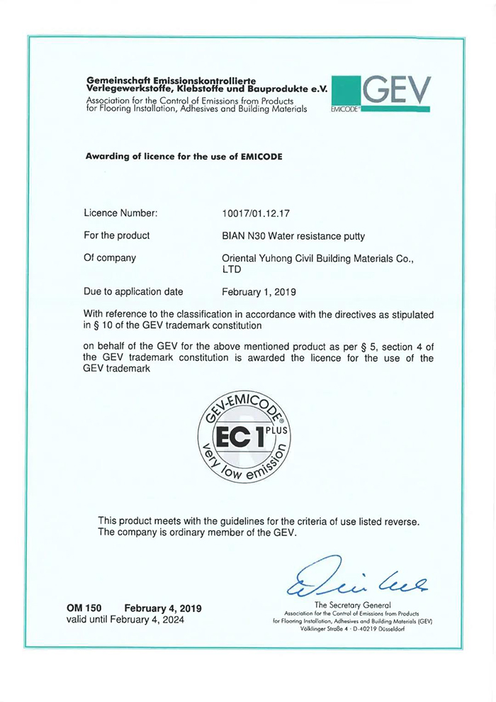 壁安抗堿防霉型N30耐水膩?zhàn)油ㄟ^(guò)歐洲建材環(huán)保性能權(quán)威認(rèn)證機(jī)構(gòu)——德國(guó)GEV建立的EMICODE分級(jí)體系最高標(biāo)準(zhǔn),獲得EC1PLUS證書(shū),該產(chǎn)品可最大限度保證居住環(huán)境的空氣質(zhì)量。