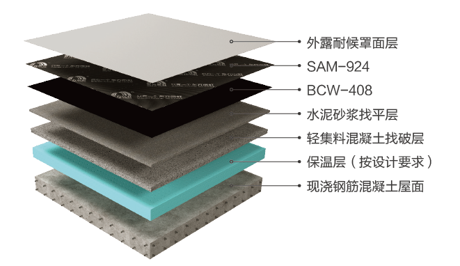 外露耐候罩面層材料推薦:HCA-108 屋面丙烯酸高彈防水涂料;HCA-200 建筑反射隔熱涂料;GES-W308 外露型水性聚氨酯防水涂料
