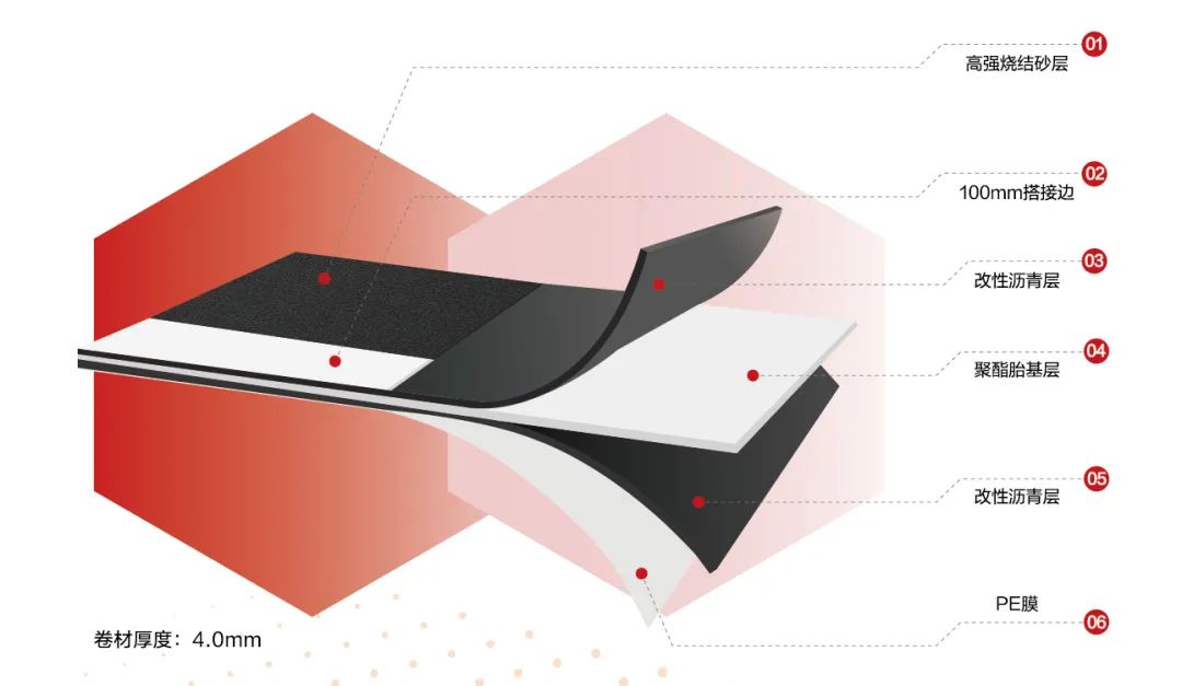 此外,卷材可與東方雨虹TZH特種非固化橡膠瀝青防水涂料/太空堡SBS改性瀝青防水卷材/PMB-741等配套使用,滿足更高防水等級設防要求。